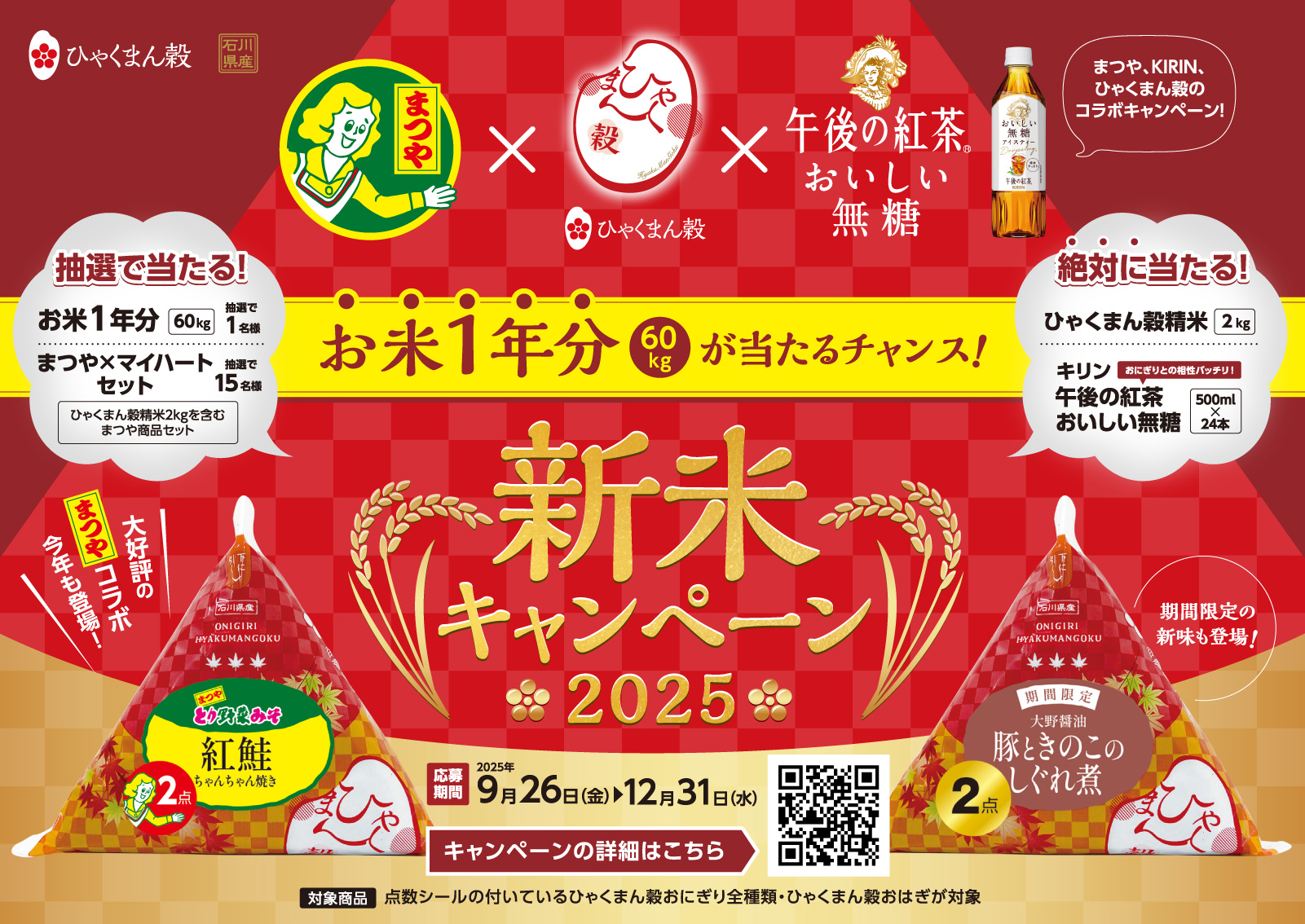毎年ご好評いただいている「ひゃくまん穀おにぎり新米キャンペーン」も開催中です。この機会にぜひ、炊きたての美味しさをぎゅっと握った新米ひゃくまん穀おにぎりをご賞味ください。