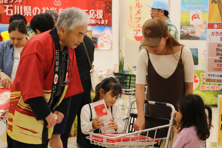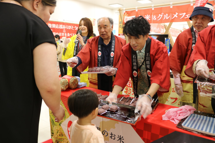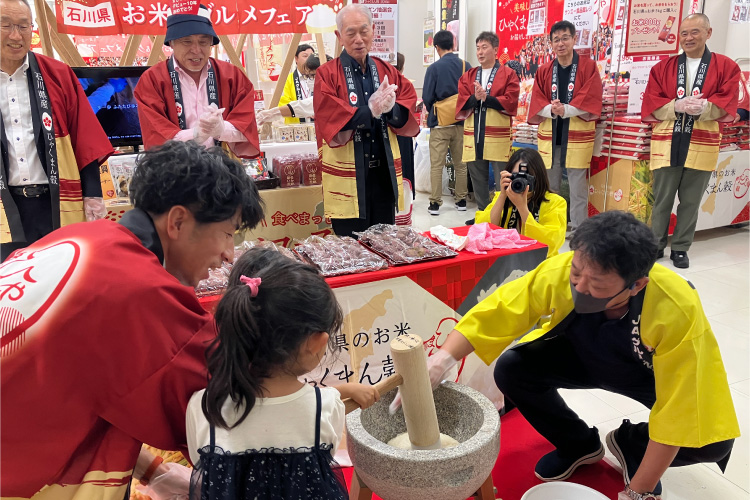 お米購入者へのプレゼント企画や餅つき体験やおはぎの振る舞い、ひゃくまん穀おにぎりの無料配布、石川県特産品が当たるガラポン抽選会など、 来場者の皆さまには、楽しみながら石川県のお米や食文化の魅力に触れていただきました。